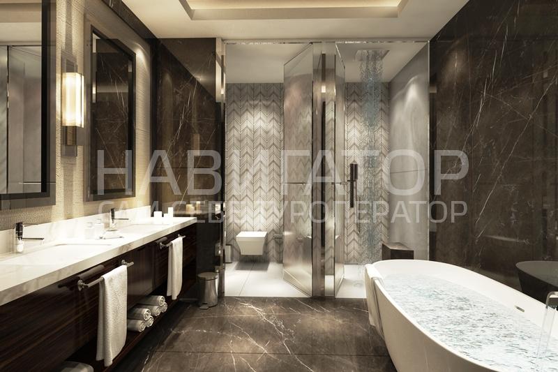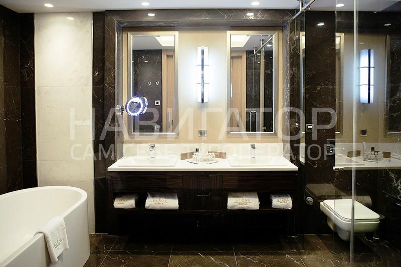 Номер укомплектован согласно высоким стандартам качественного комфорта: бесплатный WIFI и проводной интернет, LCD телевизор c опциями интерактивного телевидения, IP телефония, сейф, рабочий стол с индивидуальным освещением, теплое и холодное кондиционирование, ванная и душ в ванной комнате, подогрев пола. гостевая ванная. Площадь номера- 105 м2