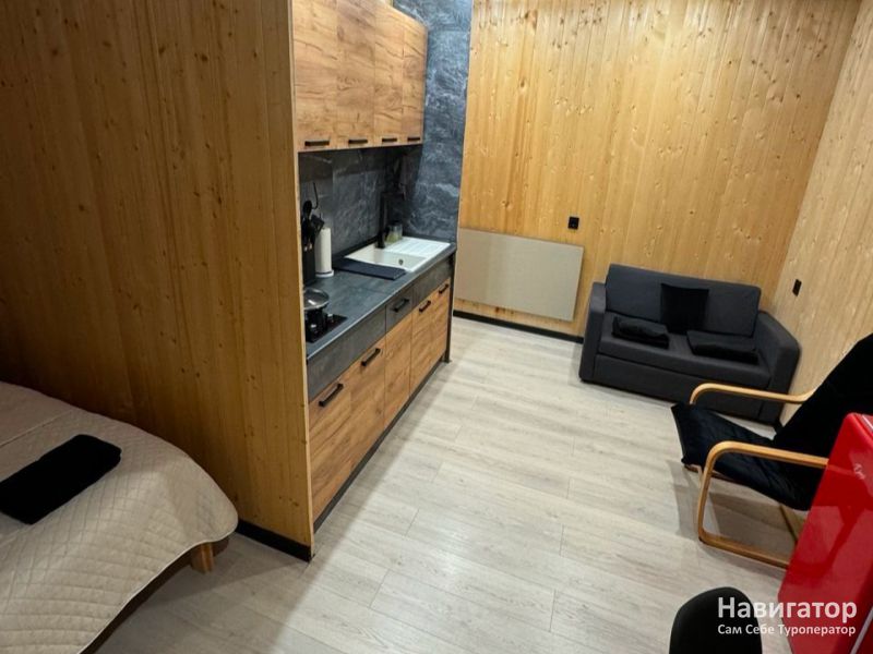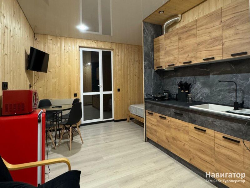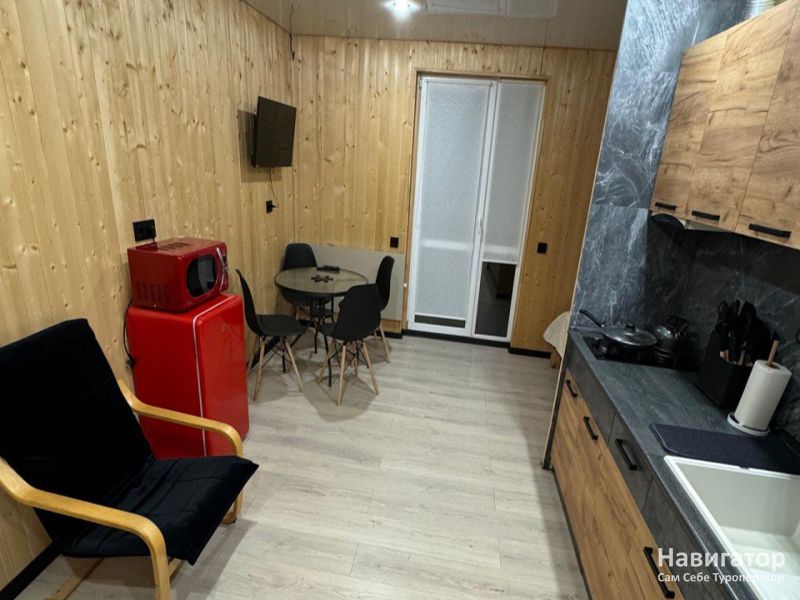 Приглашаем вас в комфортабельный дом для отдыха компанией до 4 человек. Пространство оформлено как светлая студия с встроенной кухней и собственной ванной комнатой. Для вашего удобства есть двуспальная кровать и диван, а также вся необходимая посуда, техника и свежие комплекты белья.