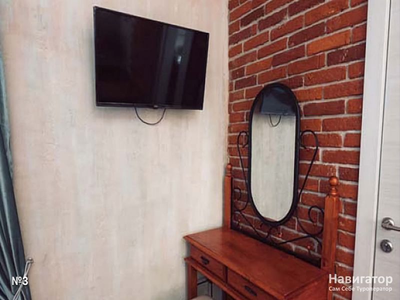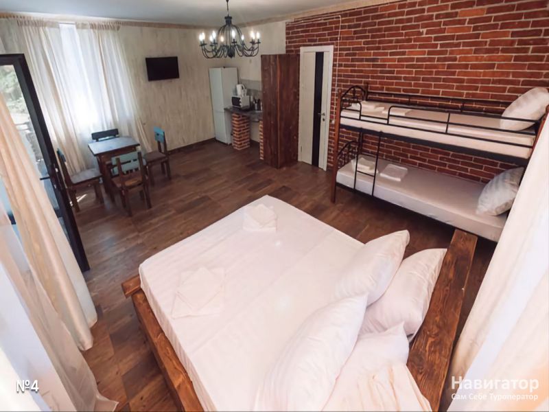 Апартаменты-студия 4-х местные, 45 кв.м. В комнате: двуспальная кровать, двухъярусная кровать, стол, стулья, телевизор, шкаф, комод, журнальный столик, тумба, сплит-система.