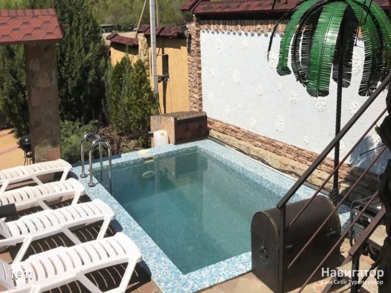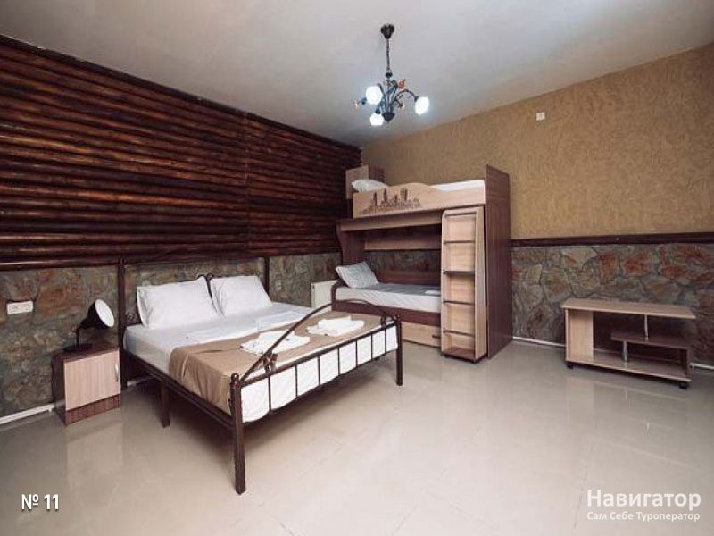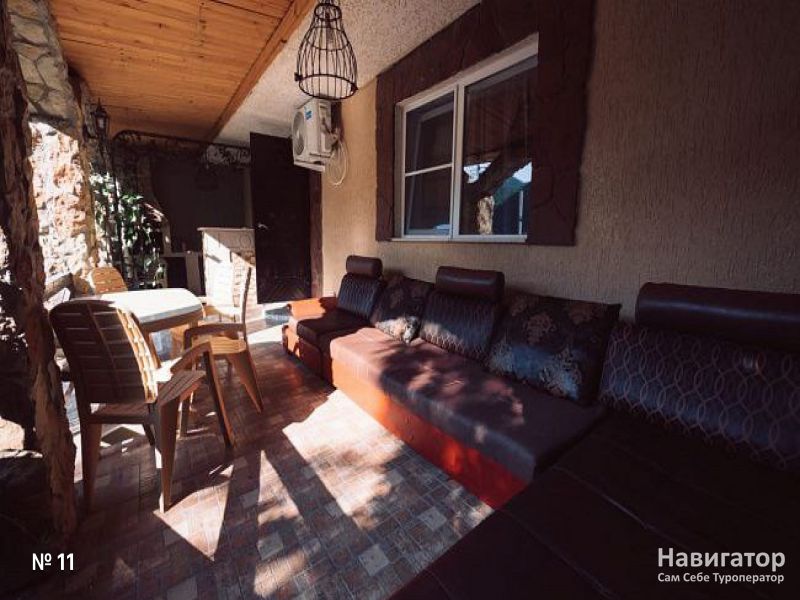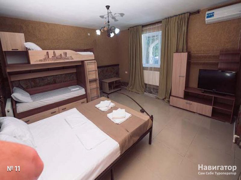 №11 Апартаменты 5-ти местные, 56 кв.м. Отдельная оборудованная кухня, санузел и душ. В комнате: двуспальная и двухъярусная кровати, двуспальный диван (все спальные места в одной комнате), тумбочки, телевизор, шкаф, столы и стулья, сплит-система. Отдельный вход и собственная, укомплектованная мебелью, большая терраса 30 кв.м.