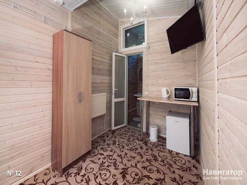 №12 Номер-студия 2-х местный, 16 кв.м. В комнате: двухместный раскладной диван, телевизор, столик, барные стулья, шкаф, сплит-система. Отдельный вход, небольшая оборудованная кухонная зона, санузел и душ, собственная, укомплектованная мебелью, терраса 10 кв.м., 1 этаж.