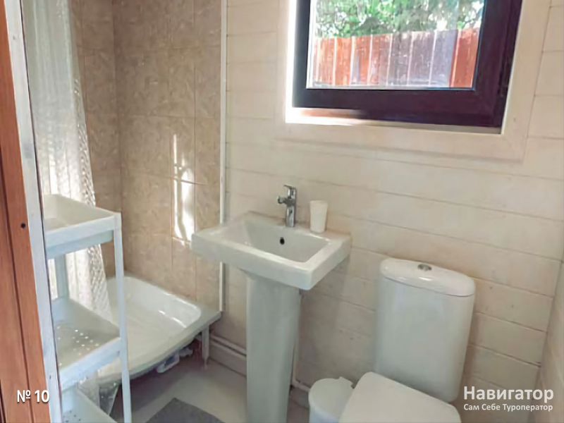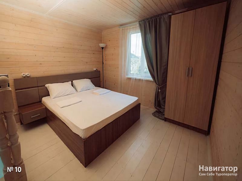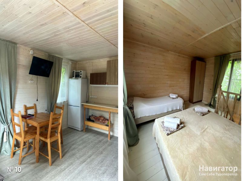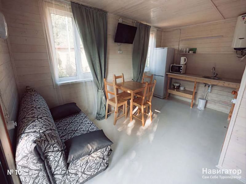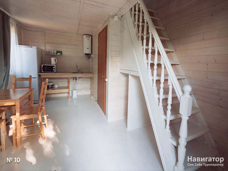 №10 Отдельно стоящий 2-х этажный коттедж, 5-ти местный, 35 кв.м. 1 этаж: оборудованная кухня, диван раскладной, телевизор, тумба, стол, стулья, санузел и душ. Лестница на второй этаж (неизолированный).